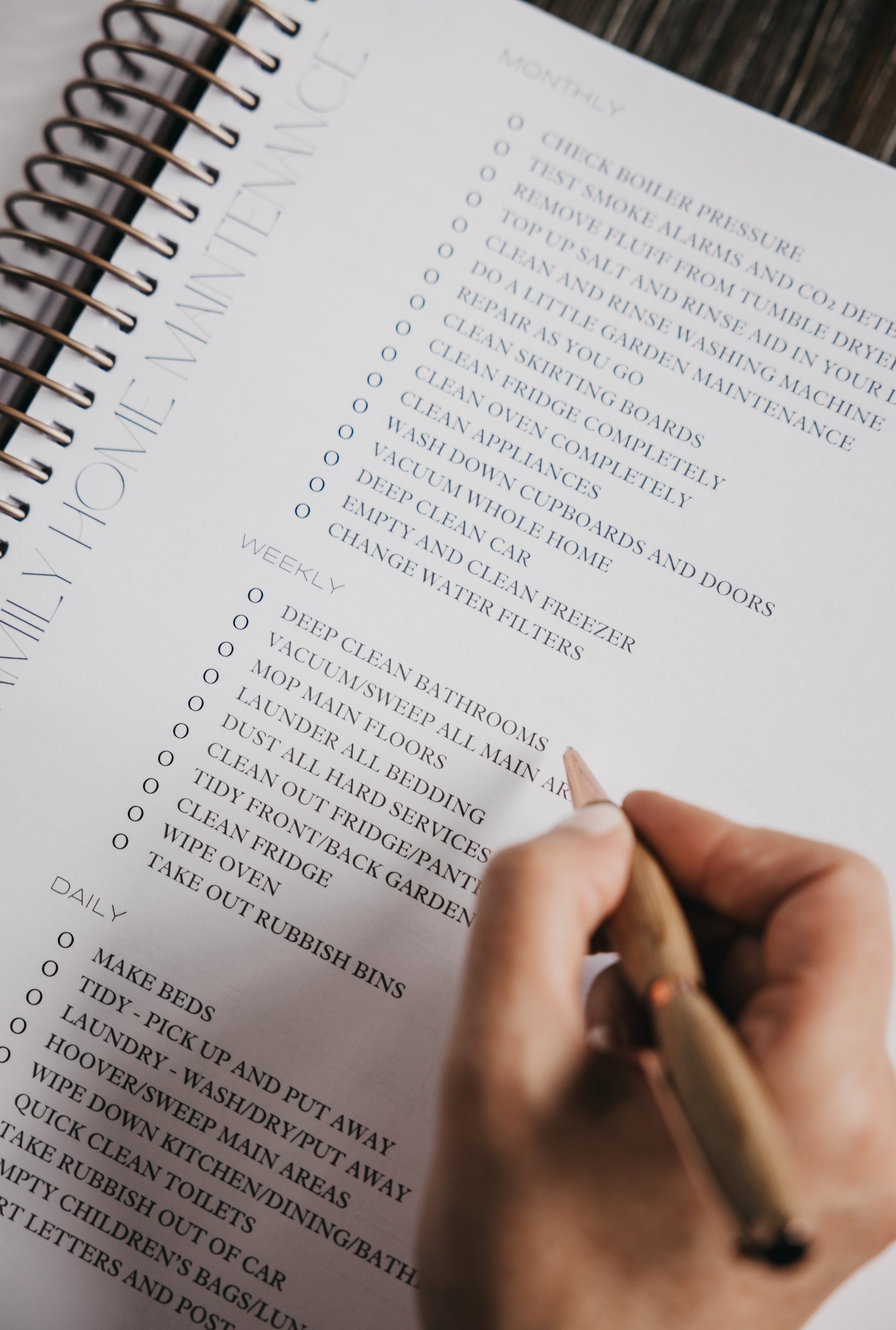 Our planner includes: annual Wish List, goal guidance with space for personal and family goals, productivity ideas, home maintenance checklists, family and charity contributions, travel organisation, school information, monthly parenting themes, 52 conversation starters, notes pages, monthly budget trackers, worksheets to support with overwhelm and finding joy, weekly and daily completed examples, monthly overviews, daily full page diary, end of the week 'overload' pages, quarterly 'ta-da' exercises, mid-year refocus, end of year review, key information pages and memento keepsakes.