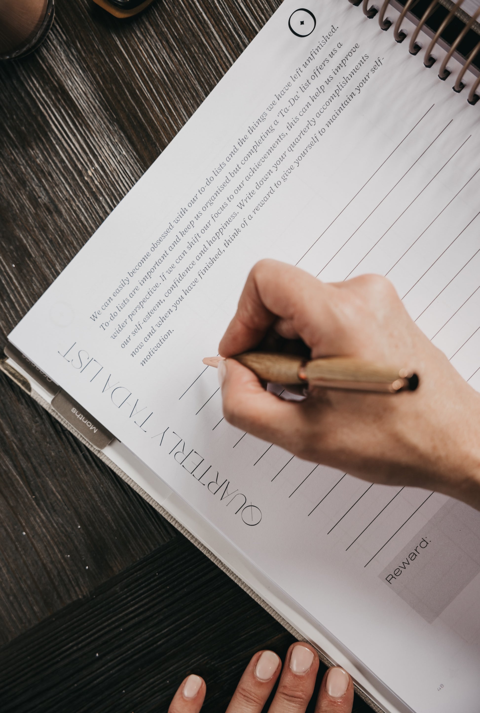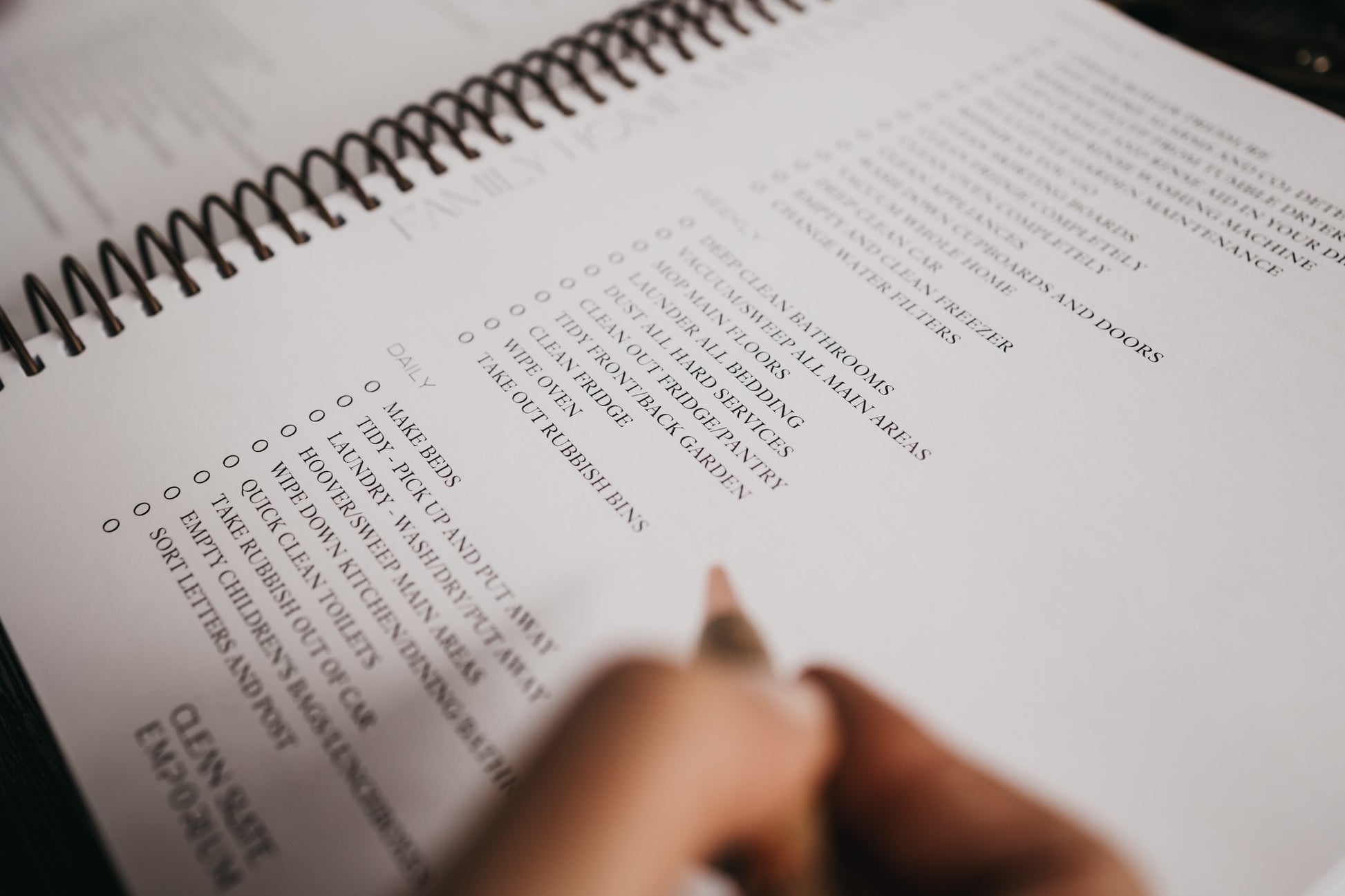 Our planner includes: an annual 'wish list', goal guidance with space for personal and family goals, productivity ideas, home maintenance checklists, family and charity contributions, travel organisation, school information, monthly parenting themes, 52 conversation starters, notes pages, monthly budget trackers, worksheets to support with overwhelm and finding joy, weekly and daily completed examples, monthly overviews, weekly diary, end of the week 'overload' pages, quarterly 'ta-da' exercises, mid-year refocus, end of year review, key information pages and memento keepsakes.